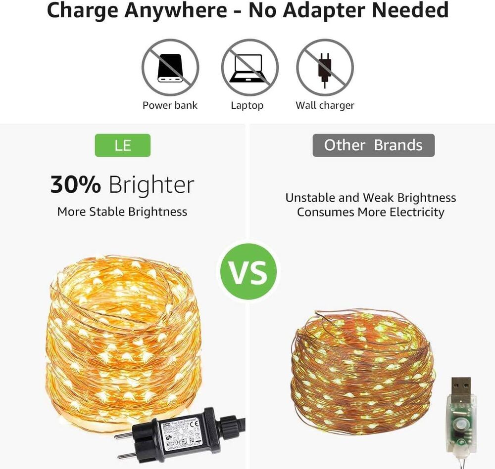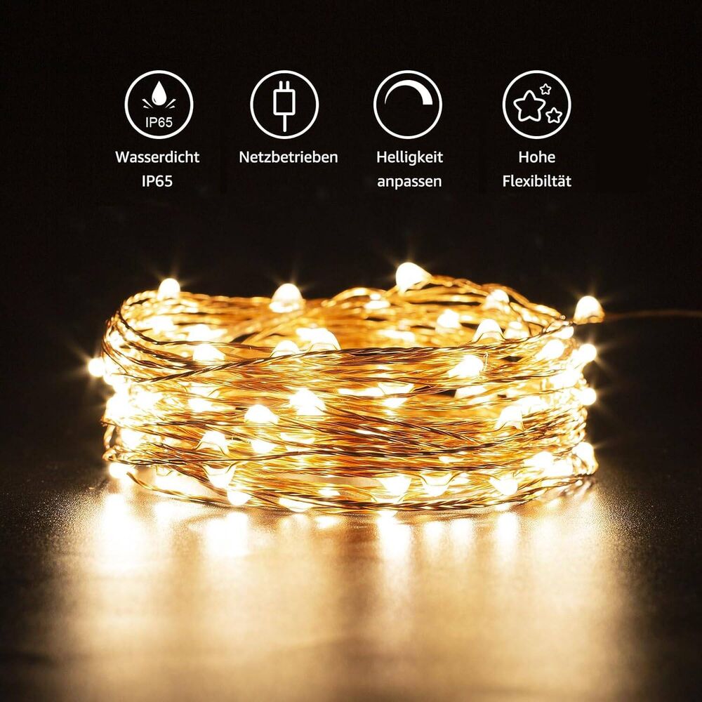LE 10M LED Lichterkette aus Kupferdraht, 100 LEDs, Wasserdicht IP65, Strombetrieben mit Stecker, ideal für Weihnachtsdeko, Innen, Außen, Weihnachten Party usw. Warmweiß