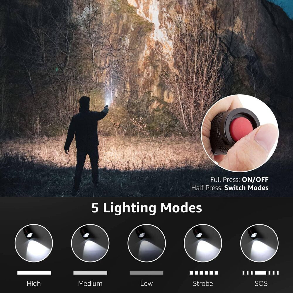 - 5 Vielseitige Beleuchtungsmodi: Das Flashlight verfügt über fünf Modi: Hoch, Mittel, Niedrig, SOS und Blitz. Perfekt für Outdoor-Aktivitäten wie Angeln, Laufen, Camping und Wandern.