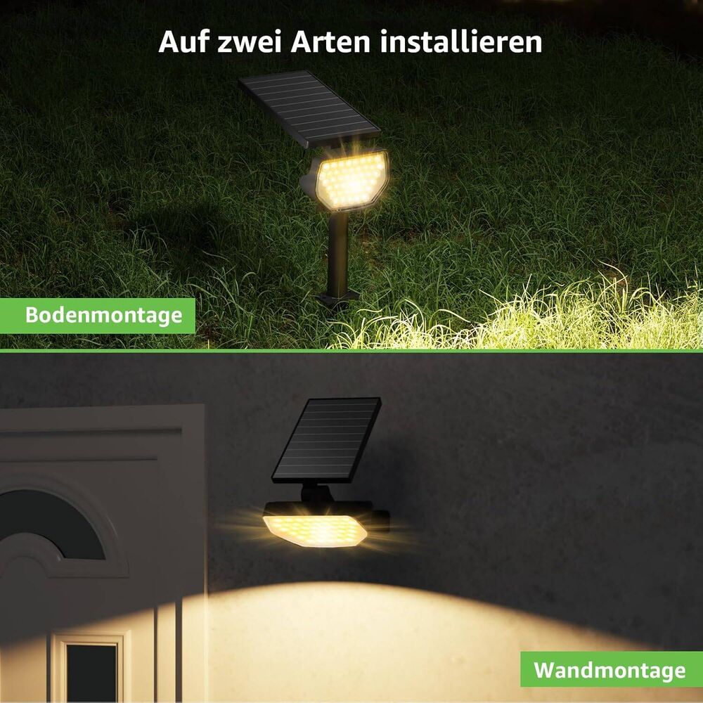 - 2-in-1-Installation: Unsere Solarlampen für außen garten können auf zwei Arten installiert werden: Bodenmontage oder Wandmontage Geeignet für verschiedene Gebiete, wie Garten, Pool, Gehwegbereich, Garage, Terrasse, Hof, Rasen, Weg, Eingang, usw. Jede Packung enthält 2 Solarlampen, 2 Erdspieße, 4 Dübel und 4 Schrauben.