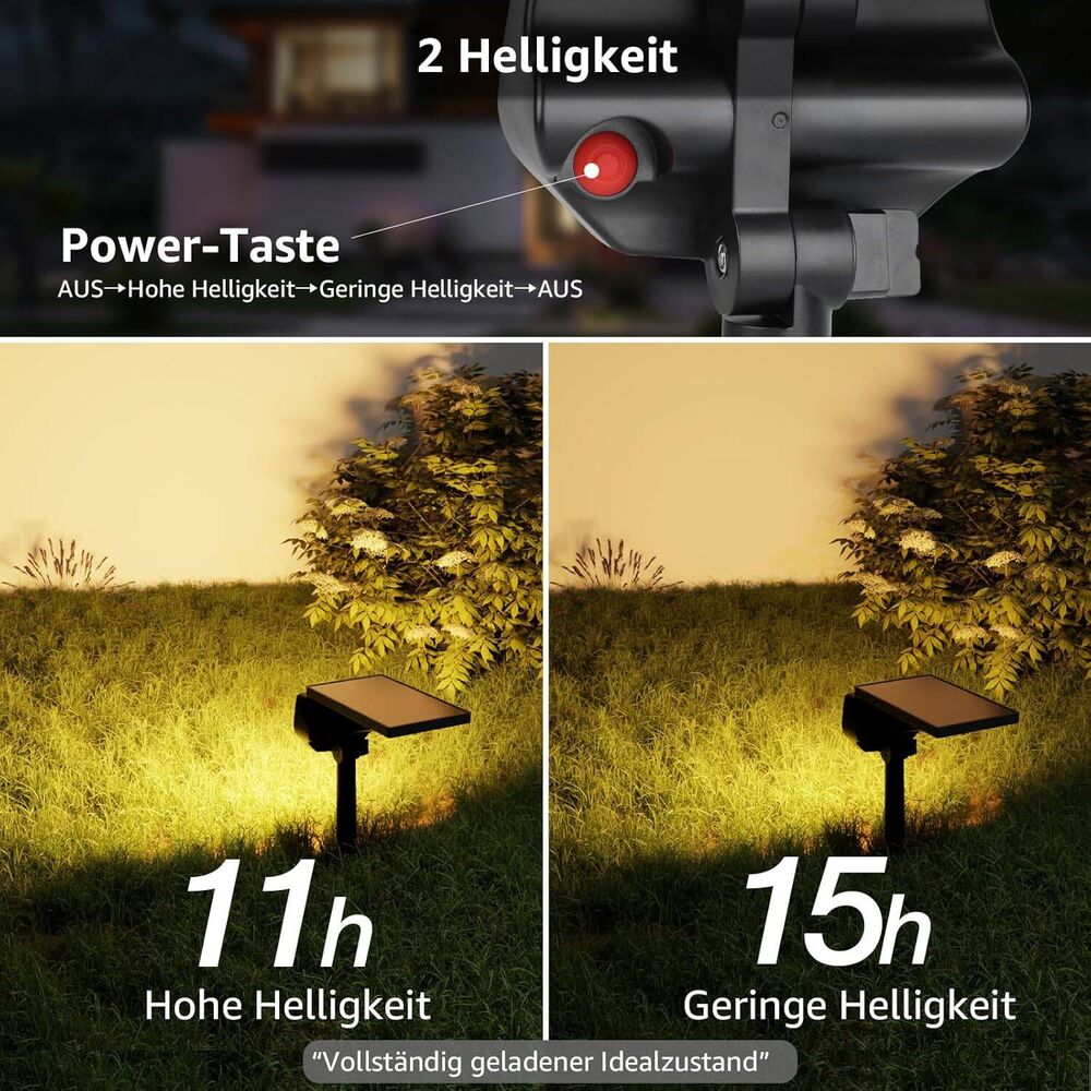 - Langlebig mit zwei Beleuchtungsmodi: Diese Solarleuchte hat zwei verschiedene Beleuchtungsmodi: 1.) Starkes Licht mit 120lm für ca. 11 Stunden Leuchtdauer und 2.) Schwaches Licht mit 50lm für ca. 15 Stunden Leuchtdauer. Normalerweise kann eine 6-8 stündige Solarladung während des Tages die ganze Nacht leuchten.
