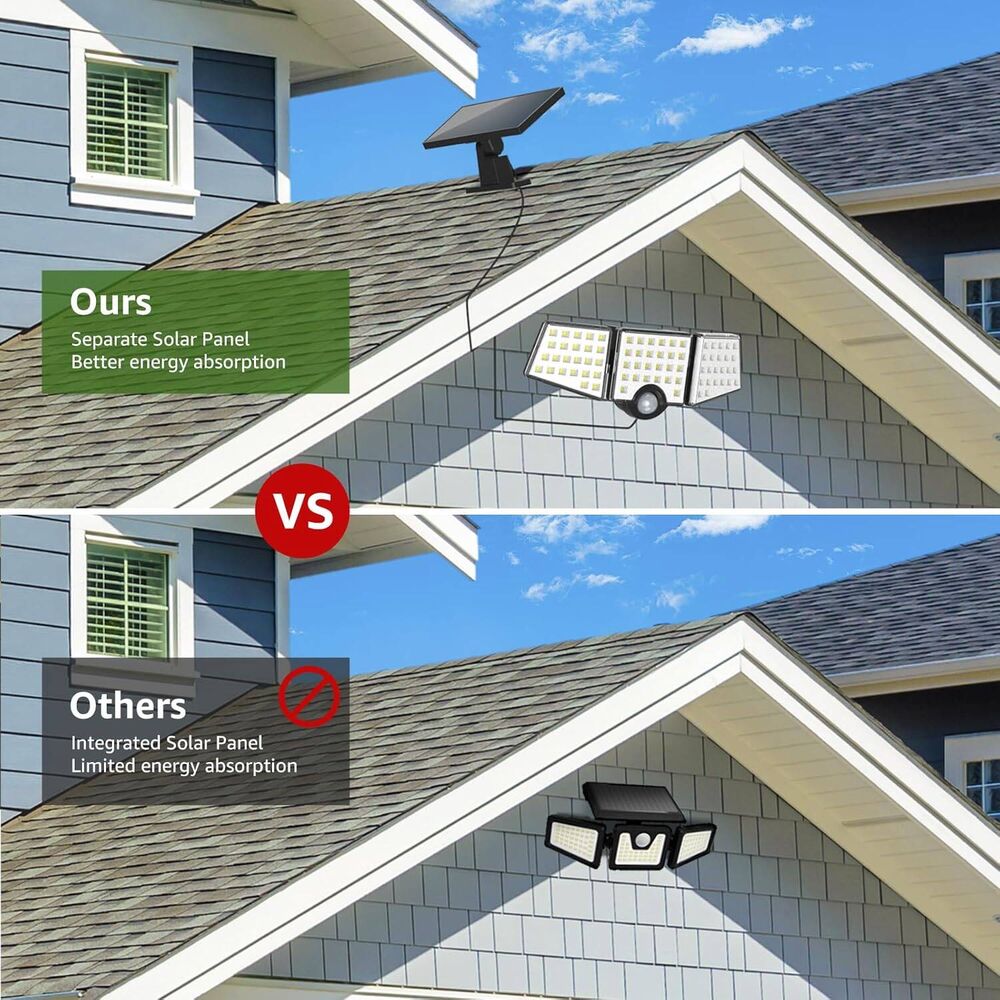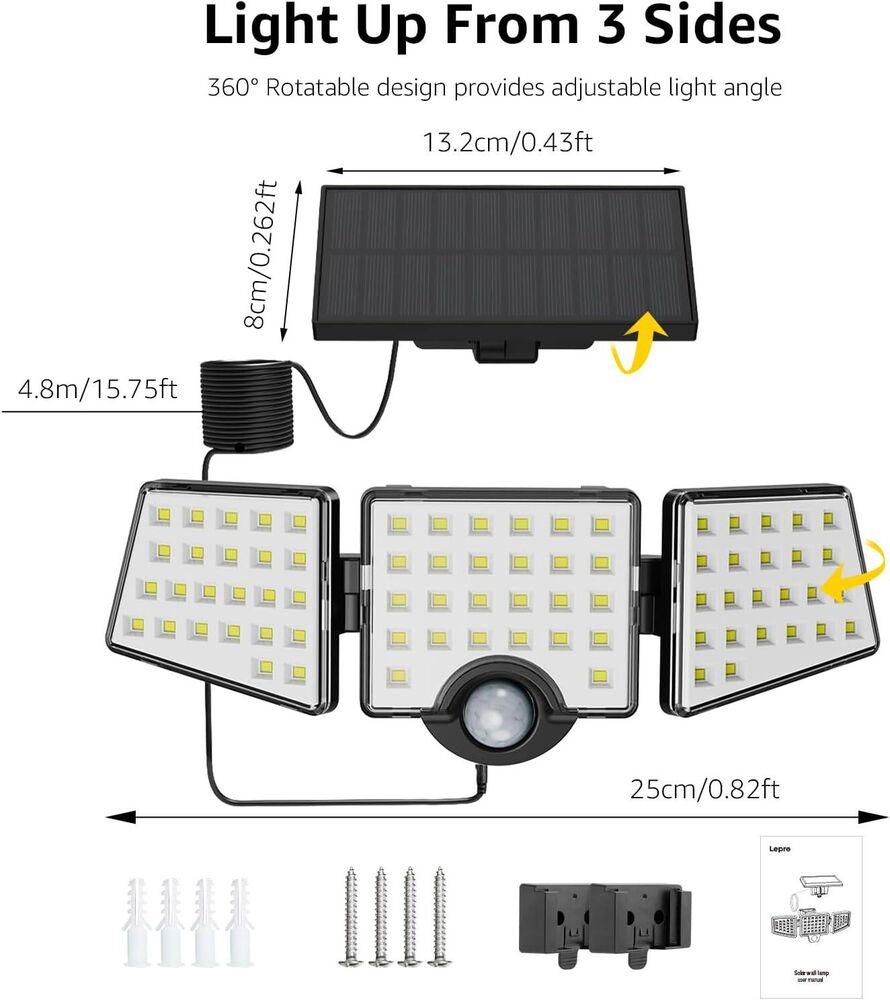 - 【1200LM Helligkeit und 360° Drehbares Panel】Die solarlampen für außen bewegungsmelder mit 72 LEDs und 3 drehbaren Leuchtpanelen geliefert. Sie hat einen Ausleuchtungswinkel von bis zu 270°. Diese LED-Solarleuchte schafft eine helle und sichere Umgebung für Balkone, Terrassen, Flure, Treppen, Fassaden, Gärten, Garagen und Gehwege.