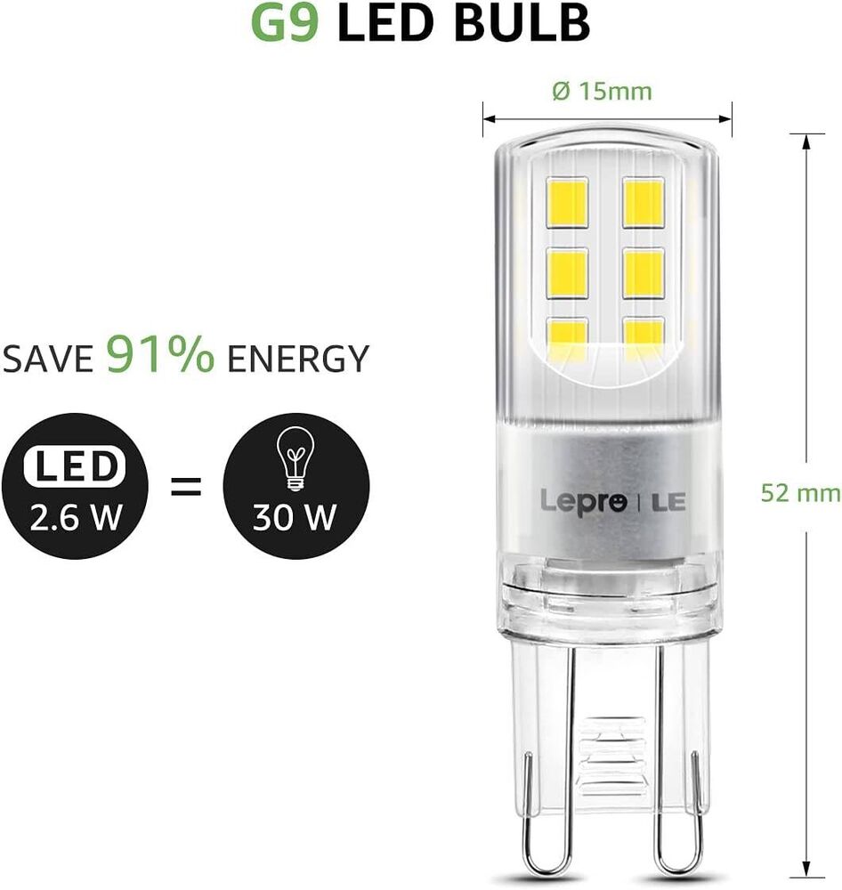 Jede 2.6Watt LED G9 Lampe entspricht einer 30W Halogenlampe und spart 91% Energie. Außerdem können sie bis zu 15.000 Stunden dauern, wodurch die Häufigkeit des Lampenwechsels verringert und Ihre Wartungskosten gesenkt werden.