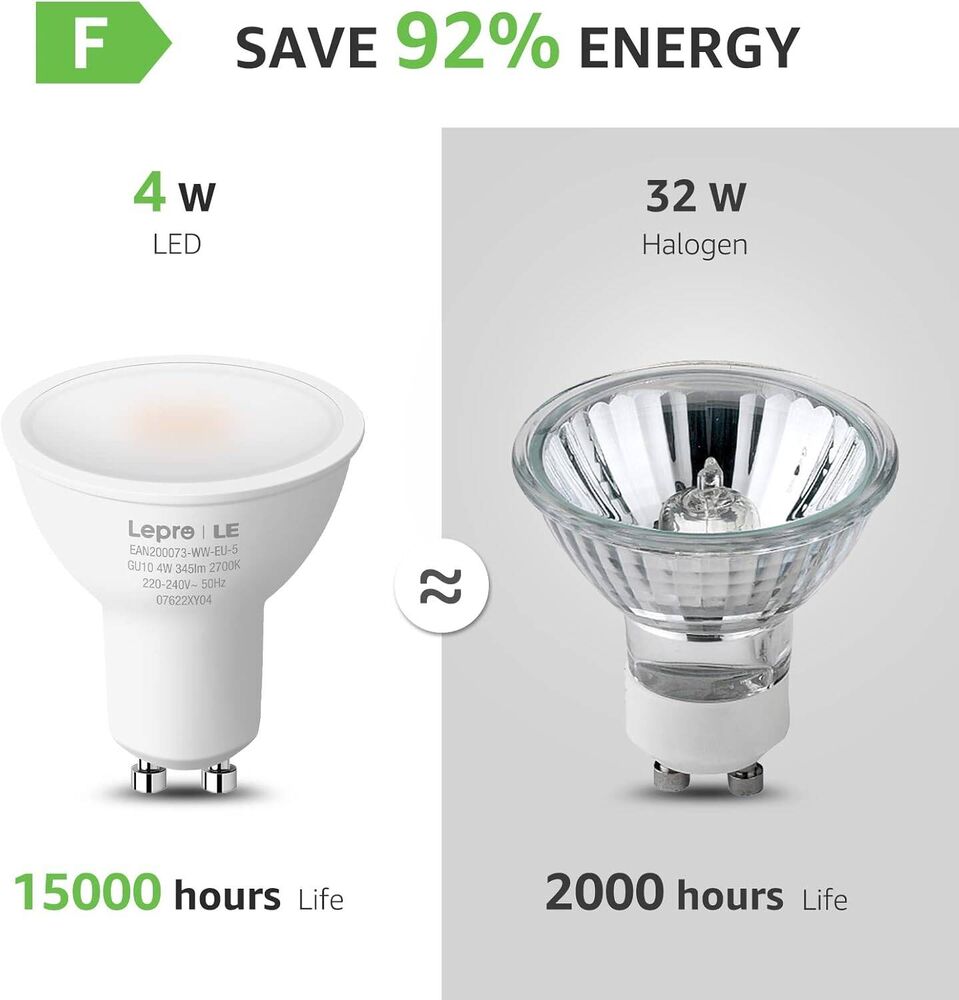 - Was sie Bekommen: 5 neue LED-Reflektorbirnen GU10 in hervorragender Qualität. Lepro ist eine spezialisierte Marke, die nur Lampen verkauft und Ihnen das Beste an Waren und Dienstleistungen bieten möchte. Hinweis: Laut den neuen ERP-Normen (EU 2019/2015) entspricht die frühere Energieeffizienzklasse "A+" der heutezutagen Energieeffizienzklasse "F". An der Energieeffizienz ändert sich nichts, nur die Berechnungsmethode der Energieeffizienzklasse ist anders.