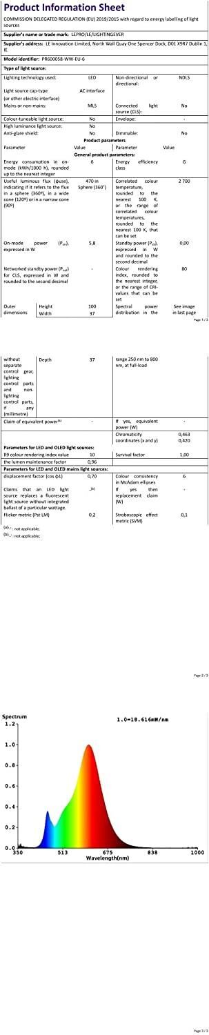 | Frequenz (Hz) | 50 | Helligkeit (lm) | 470 |