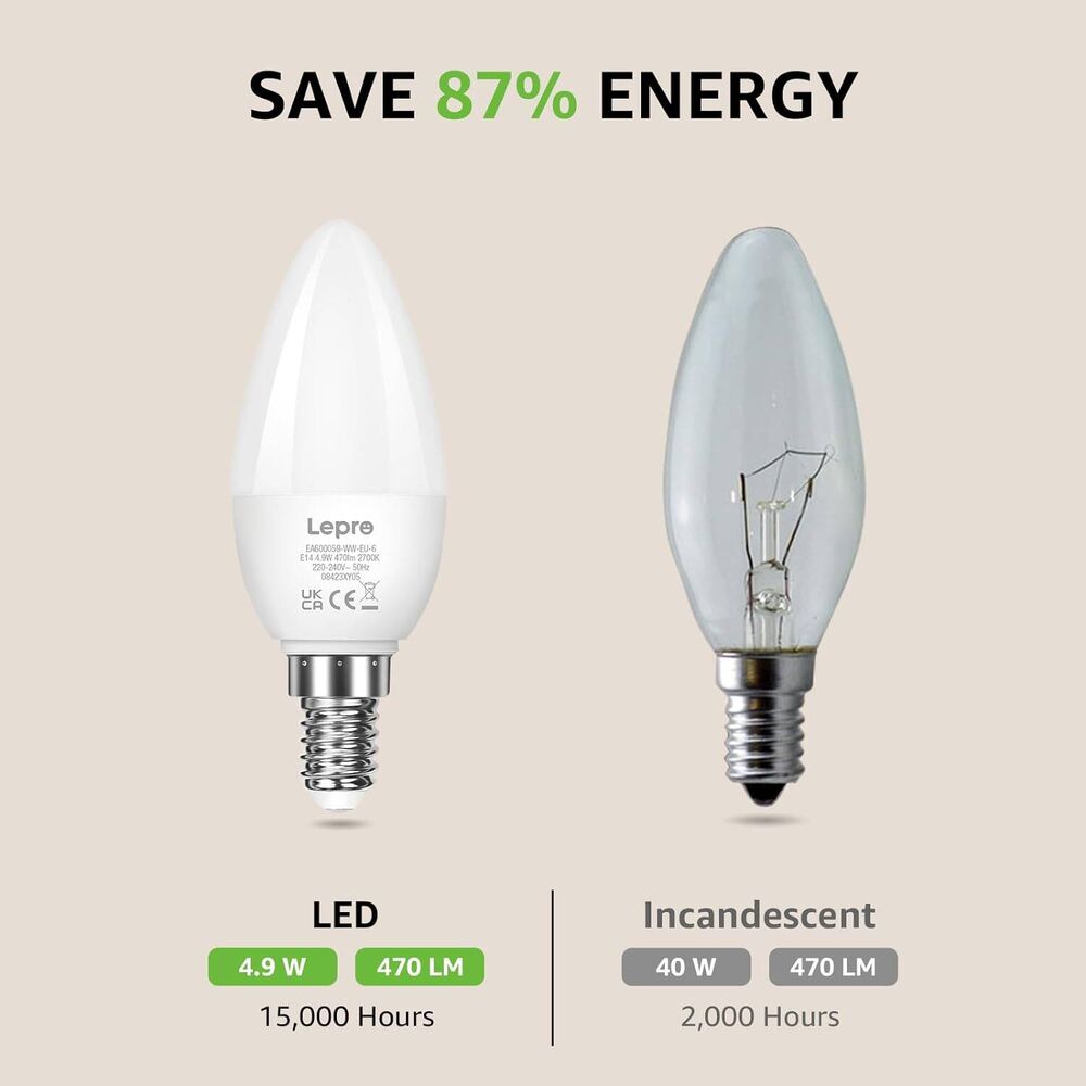 Lepro E14 LED, E14 LED Warmweiss, LED E14 4.9W, Glühbirne E14 470 Lumen, 6er-Pack, ersetzt 40W Birne, C37 2700K Warmweiß Glühlampe E14, 200° Leuchtmittel E14, Kerzenleuchten