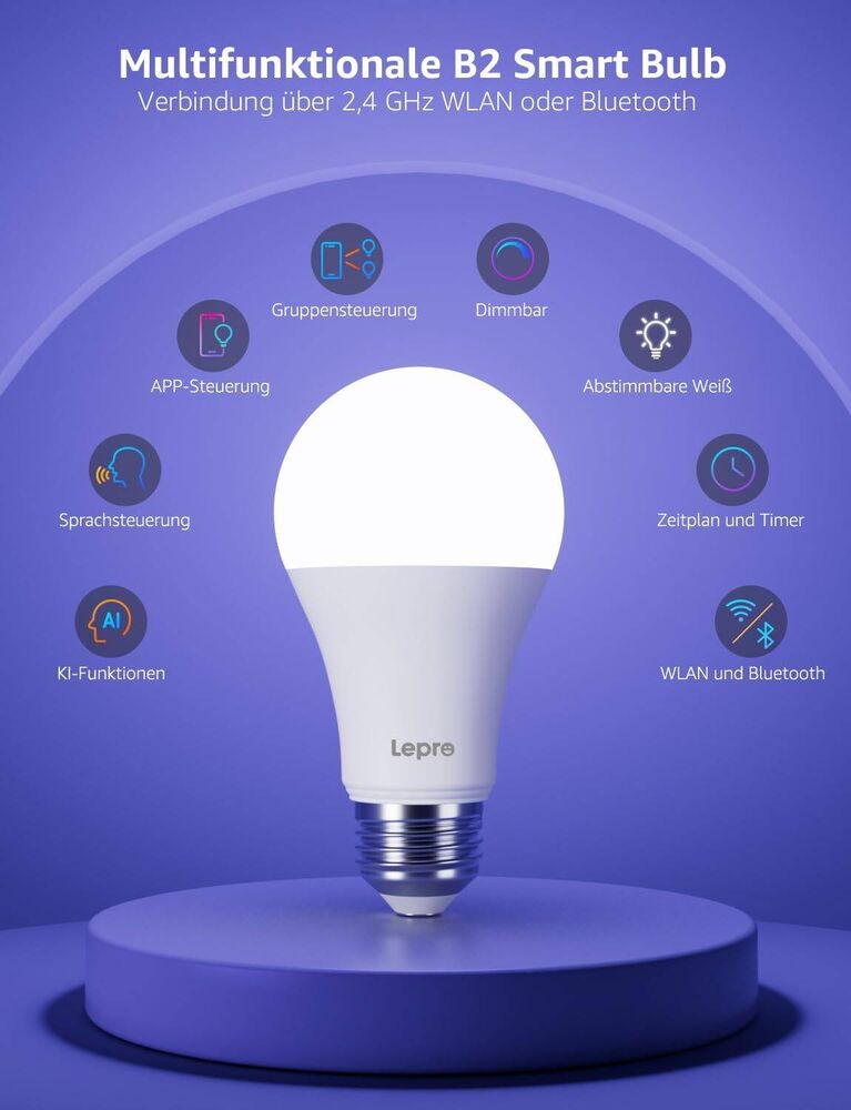 Lepro AI Smart Glühbirne B2, E27 lampe 10W 1100lm Dimmbar, Personalisierter KI-Lichtdesigner, Sprachsteuerung/Musik Sync, WiFi & Bluetooth Smart Bulb, Kompatibel mit Alexa/Google Assistant, 4 Stück