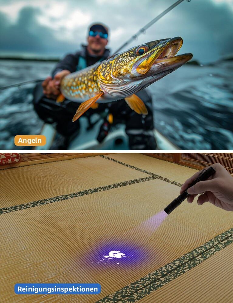 - [365nm UV-Licht] - Der entscheidende Vorteil! Mit einer Wellenlänge von 365nm bietet diese UV-Taschenlampe eine deutlich präzisere Detektion als herkömmliche 395nm Lampen. Unsichtbares wird sichtbar: Haustierurin, versteckte Flecken auf Teppichen und Böden – nichts entgeht dem 365nm Licht! Auch ideal zur Echtheitsprüfung von Dokumenten.