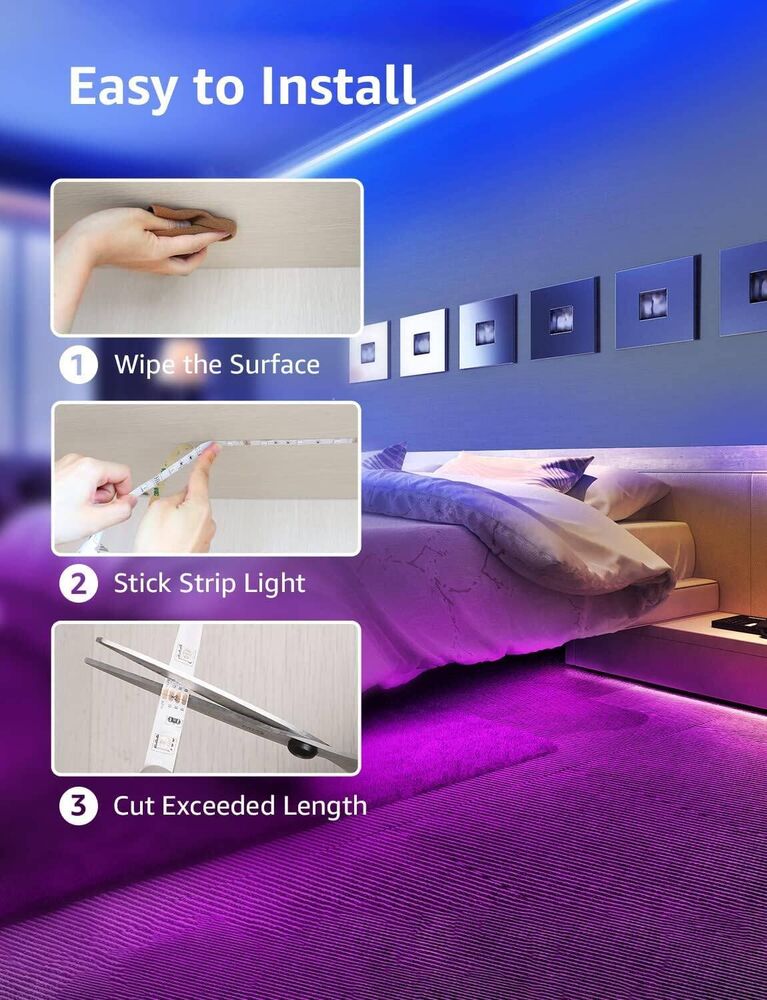 - Starkes 3M-Klebe & Schneidedesign: Das LED Streifen kann dank 3M-Klebstoff leicht auf eine trockene, flache Oberfläche geklebt werden(Bitte reinigen Sie die Oberfläche vor der Installation). Es werden 5 Befestigungklemme vorgeschlagen, die zur besseren Fixierung gleichzeitig verwendet werden. Außerdem können Sie es entsprechend der Schnittmarkierung schneiden.