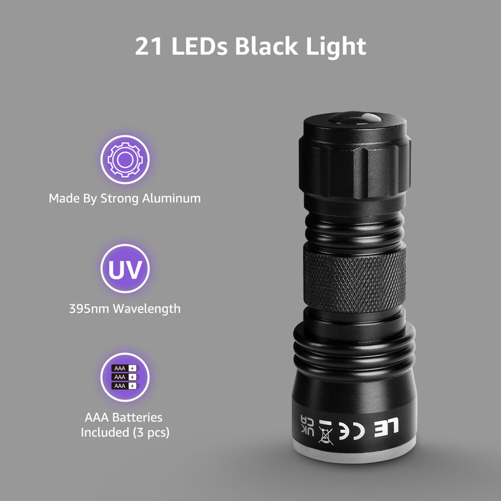- Hinweis und Batterien: Nicht direkt in das UV-Licht schauen und auch keine anderen Personen oder Tiere in die Augen leuchten. Das Tragen einer UV-Schutzbrille wird empfohlen. Es wird 3xAAA-Batterien geliefert.