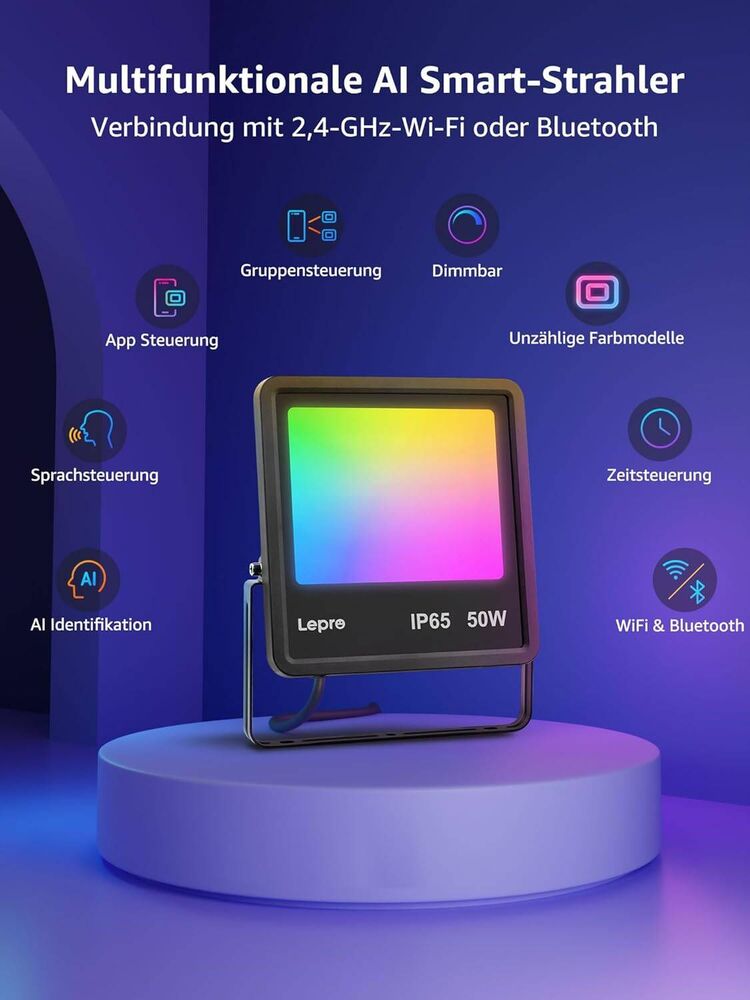 Lepro AI Smart 50W Led Strahler Außen F1, RGB Dimmbar Außenstrahler, Personalisierter KI-Lichtdesigner, Musik Sync/APP Sprachsteuerung, IP65 Wasserdicht Fluter für Garten, Kompatibel mit Alexa/Google