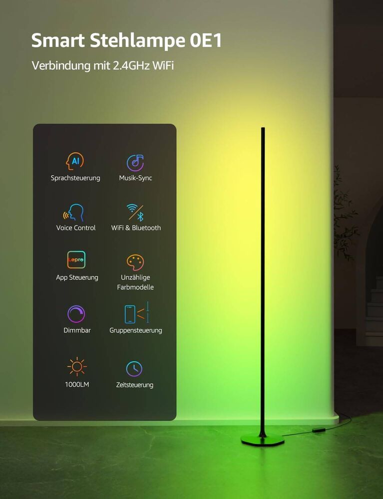Lepro AI Smart Stehlampe Wohnzimmer OE1, Stehlampe Dimmbar, Sprachsteuerung/Musik Sync/DIY, Personalisierter KI-Lichtdesigner, Kompatibel mit Alexa/Google, 16 Millionen Farben