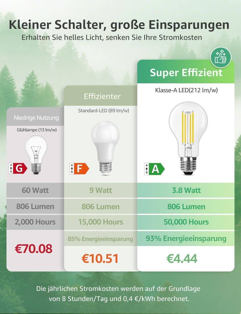 - Stromkosteneinsparung: Ein 8.5 W Glühlbirne mit Energieeffizienzklasse F kostet im Jahr €9.93 an Strom, während die Lepro 3.8W Glühlbirne mit Energieeffizienzklasse A nur €4.44 pro Jahr verbraucht – durchschnittlich €5.49 Einsparung jährlich.