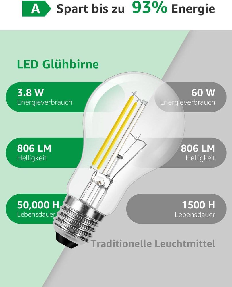 - Energieeffizienzklasse A: Lepro 3.8W E27 Led LED Glühbirne Entspricht den europäischen Energieeffizienzstandards der Klasse A, Ersetzt 60W Leuchtmittel, Sparen Sie bis zu 93% Ihrer Energiekosten.