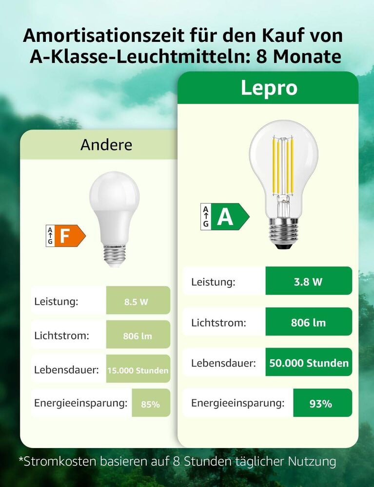 - Stromkosteneinsparung: Ein 8.5 W Glühlbirne mit Energieeffizienzklasse F kostet im Jahr €9.93 an Strom, während die Lepro 3.8W Glühlbirne mit Energieeffizienzklasse A nur €4.44 pro Jahr verbraucht – durchschnittlich €5.49 Einsparung jährlich.