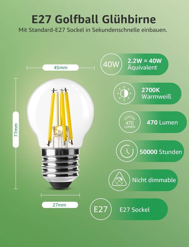- Einfache Montage: Um die herkömmliche Glühbirne zu ersetzen, wird diese LED direkt in den E27-Sockel gedreht.