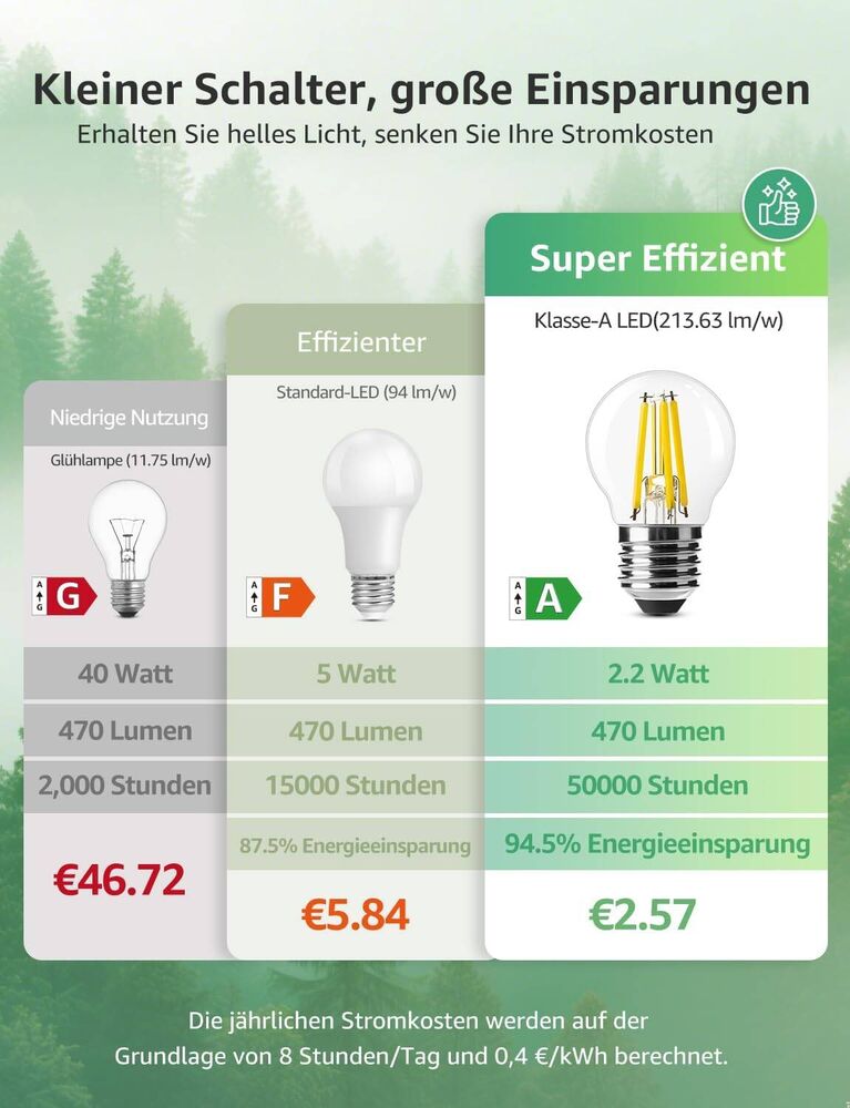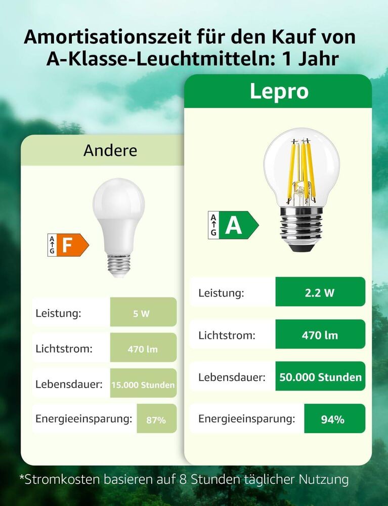 - Stromkosteneinsparung: Ein 5 W Glühlbirne mit Energieeffizienzklasse F kostet im Jahr €5.84 an Strom, während die Lepro 2.2W Glühlbirne mit Energieeffizienzklasse A nur €2.57 pro Jahr verbraucht – durchschnittlich €3.27 Einsparung jährlich.