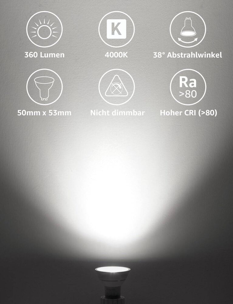 - [Neutralweiß 4000K] 360lm Weiches warmes Leuchten schafft eine gemütliche und einladende Atmosphäre, die GU10 Glühbirnen sind ideal für Küche, Wohnzimmer, Schlafzimmer, dekorative Beleuchtung, Büro, Restaurant, Hotel, Café.
