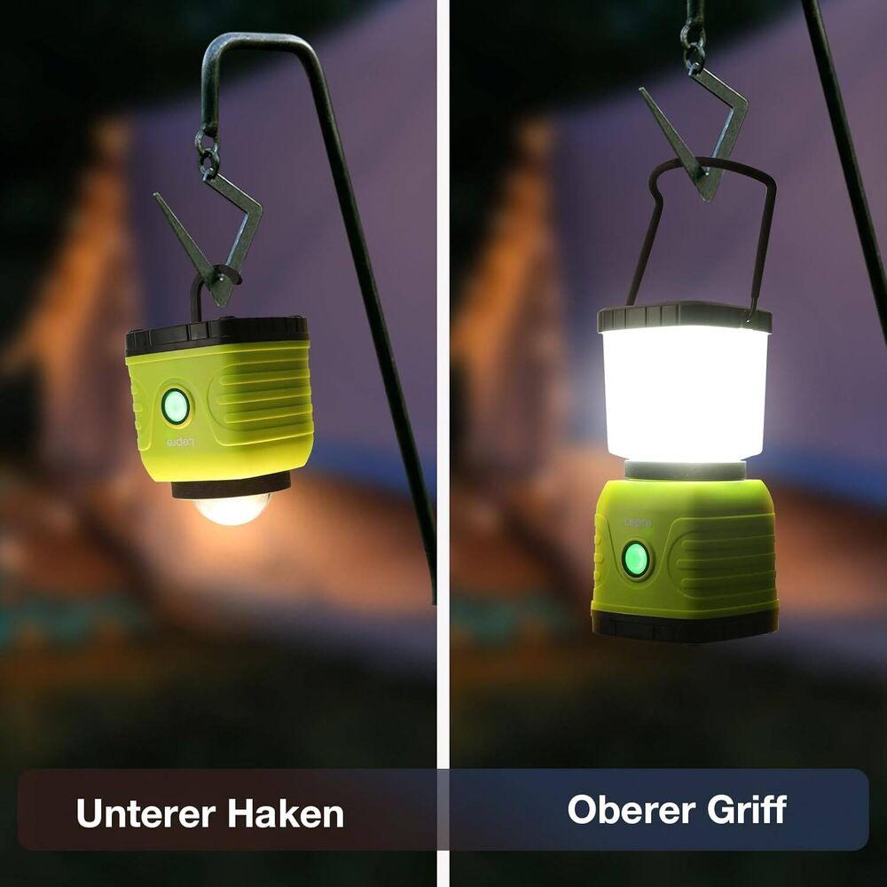 - Mit zusätzlichem Haken zum Aufhängen: An der Unterseite des Campinglaternenkopfes befindet sich ein Haken, der aufgehängt werden kann, um einen größeren Bereich zu beleuchten. Die äußere Abdeckung der Campinglaterne kann abgeschraubt werden, um eine hellere Beleuchtung zu erhalten.